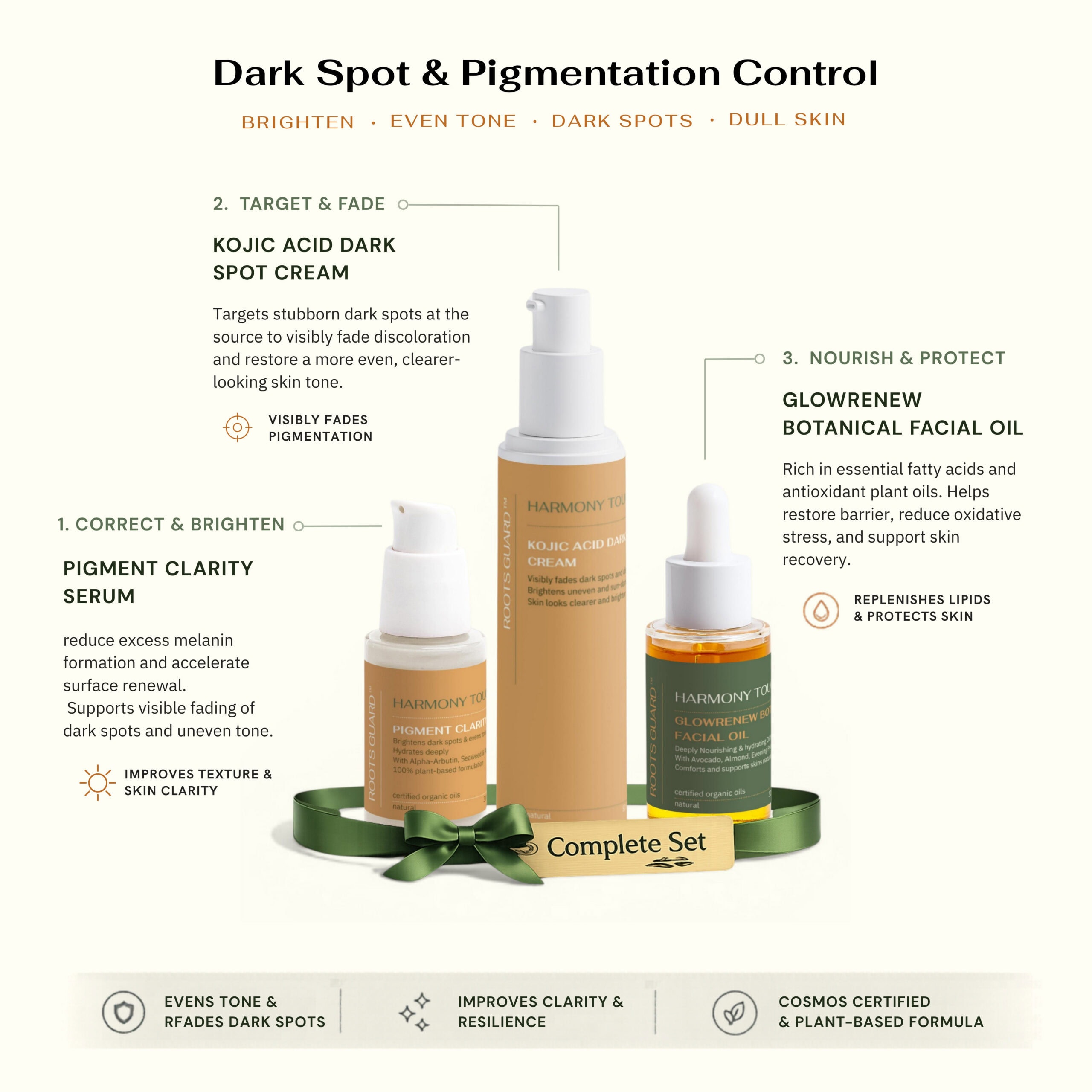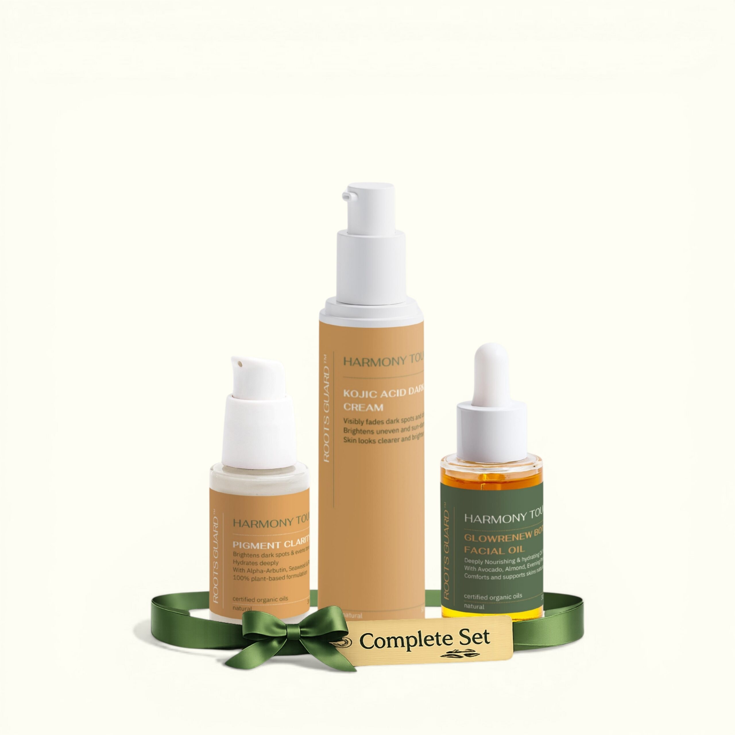 The RootsGuard Dark Spot & Pigmentation Control Bundle is a complete three-step routine built specifically for fading dark spots, blocking new pigmentation, and evening skin tone. It combines Alpha-Arbutin (a tyrosinase inhibitor that blocks melanin formation), Kojic Acid (a naturally fermented active that fades existing dark spots), and a blend of antioxidant-rich botanical oils including Rosehip, Sea Buckthorn, Evening Primrose, and Avocado that protect the skin barrier and fight the oxidative stress that triggers new pigmentation. Unlike single dark spot creams that only fade surface pigmentation, this bundle addresses all three stages of hyperpigmentation, formation, existing marks, and oxidative damage, in one routine.