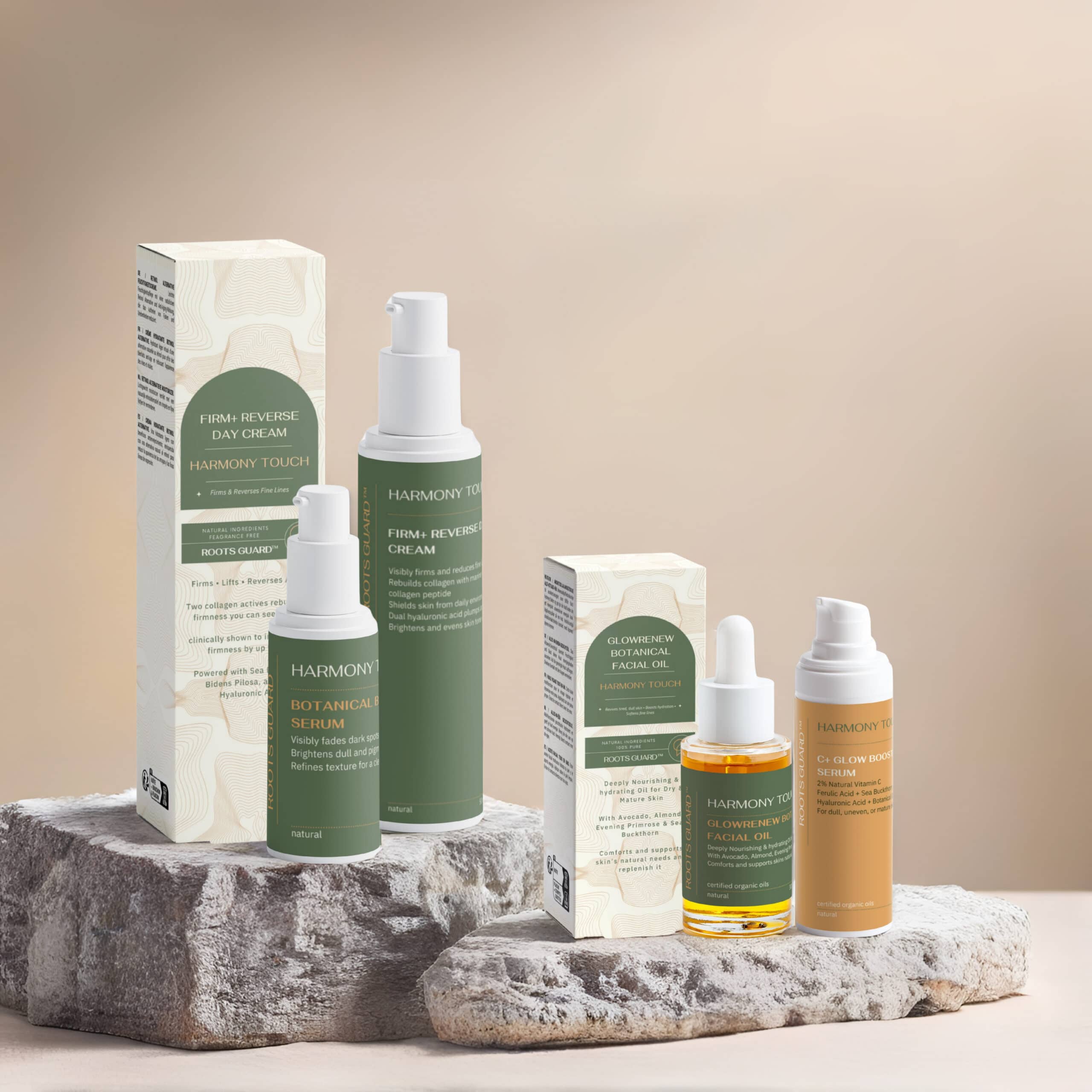 Yes, with care. If you already use synthetic retinol, use it 2-3 nights per week and substitute it in place of the Botanical Brightening Serum on those nights — then follow with the GlowRenew Facial Oil. The peptide day cream and morning Vitamin C serum pair well with any evening retinol routine. Always introduce gradually and always use SPF during the day, as retinol significantly increases UV sensitivity.