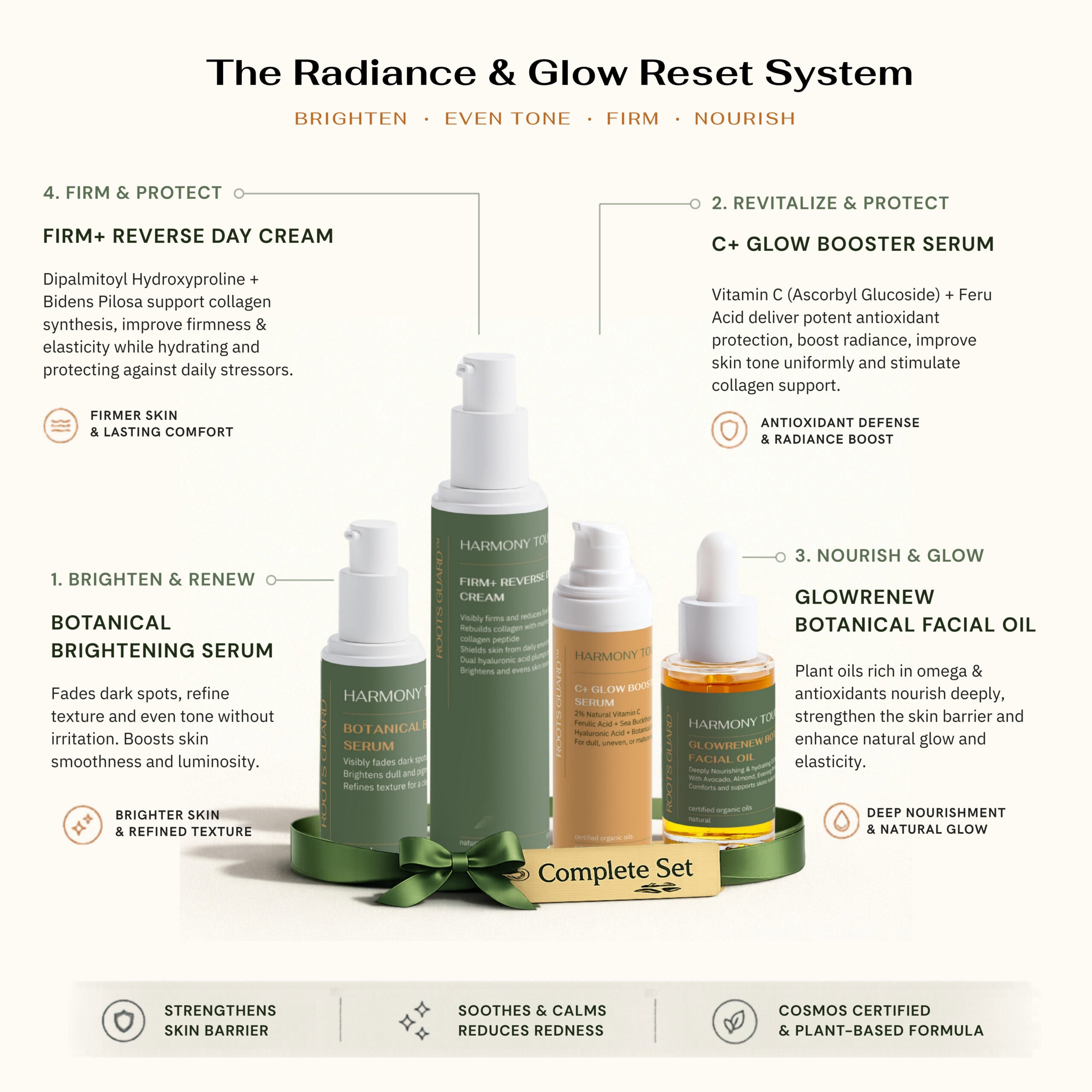 A complete day-and-night routine that brightens skin, protects against oxidative damage, and restores natural glow through Vitamin C and plant-based renewal actives.